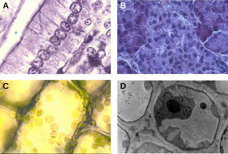 Deux types de cellules végétales : cellules de feuille d'élodée du Canada en microscopie photonique (C) et cellules de collenchyme en microscopie électronique à transmission (D).