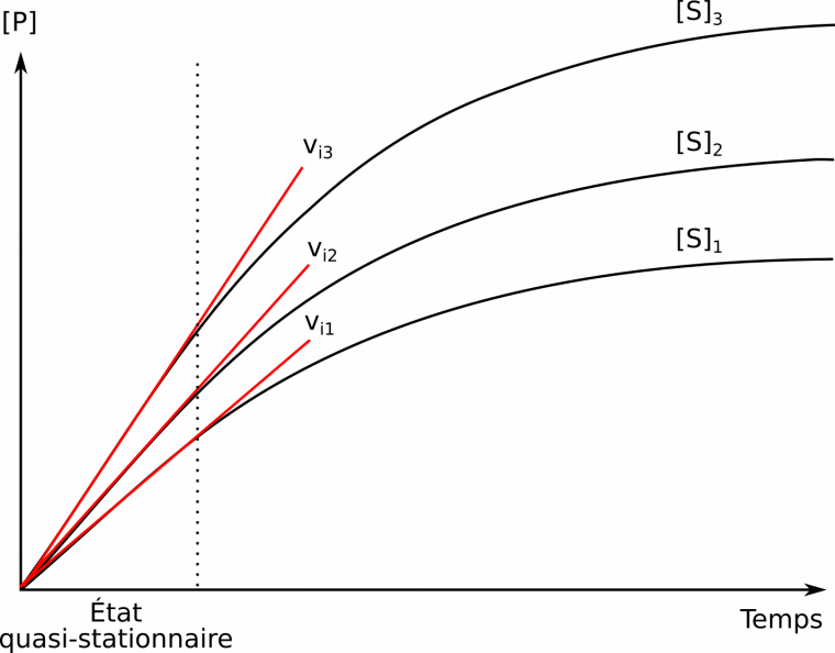 La vitesse de la réaction à un instant t s'obtient en mesurant la pente de la tangente à la courbe à cet instant t. En début de réaction, la vitesse de réaction est constante, on parle d’état quasi-stationnaire. Durant cette période la quantité de produit $P$ reste négligeable donc les conditions de Michaelis sont respectées. La vitesse de réaction déterminée sur cette période correspond donc à la vitesse initiale $v_{i}$. Puis, on constate un infléchissement de la courbe, qui traduit une diminution progressive de la vitesse de la réaction. En effet, le produit continuant à s’accumuler, la réaction inverse (disparition du produit) devient non négligeable. À plus long terme, la concentration en produit atteint un plateau, la quantité maximale de produit pouvant apparaître dépendant de la quantité de substrat introduite au début de l’expérience et des constantes cinétiques de la réaction. On constate que pour des concentrations de substrat croissantes, la concentration finale de produit ainsi que la vitesse initiale de réaction sont également croissantes.