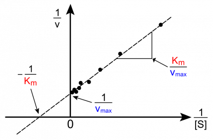 On reconnaît une équation de droite de type $ \frac{1}{v_{i}} = a \frac{1}{[S]} + b$, avec : $a = \frac{K_{M}}{v_{max}}$ (ce qui correspond à la pente de la droite) et $b = \frac{1}{v_{max}}$ (ce qui correspond à l’ordonnée à l’origine).