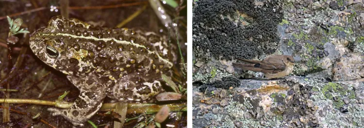 À droite : hirondelle des rochers (Ptyognoprogne rupestris). Crédit : S. Wroza, CC-BY-NC-SA, Inventaire national du patrimoine naturel.