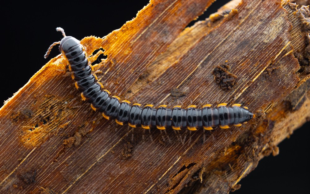 Le myriapode Orthomorpha coarctata consommant une litière de feuilles de bananier