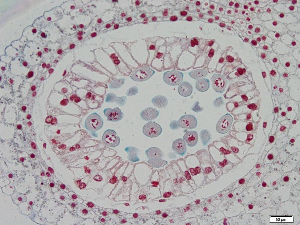 Les cellules regroupées par quatre sont le résultat typique d’une méiose. Elles sont contenues dans une paroi de callose, qui est ensuite dégradée et permet à chaque cellule de former indépendamment un grain de pollen.