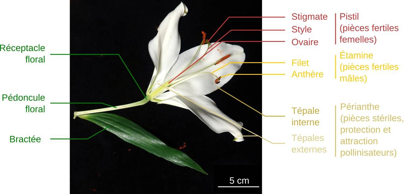 Dissection florale de lis avec les pièces de la base de la fleur en bas à gauche (bractée primaire et secondaire, pédoncule floral, réceptacle floral) et au centre les verticilles de pièces florales (de l’extérieur vers l’intérieur : 3 tépales externes ; 3 tépales internes ; 6 étamines ; 3 carpelles...