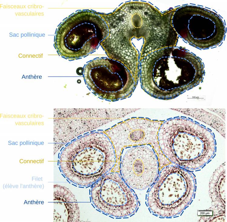 L’anthère est formée de deux paires de sacs polliniques à l’intérieur desquels se forment les grains de pollens. À maturité, les sacs polliniques s’ouvrent au niveau de la zone de déhiscence entre chaque paire et libèrent le pollen. L’anthère est portée par le filet, le tout constituant l’étamine.