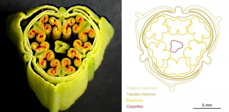 Coupe transversale de bouton de fleur de lis (Lilium sp.) réalisée à main levée (à gauche) et schéma d’interprétation correspondant (à droite). On distingue bien les verticilles externes et internes de tépales (trois tépales chacun, l’ensemble formant le périanthe), le verticille de six étamines (qui forment l’androcée) et le pistil (ou gynécée), formé de trois carpelles soudés.