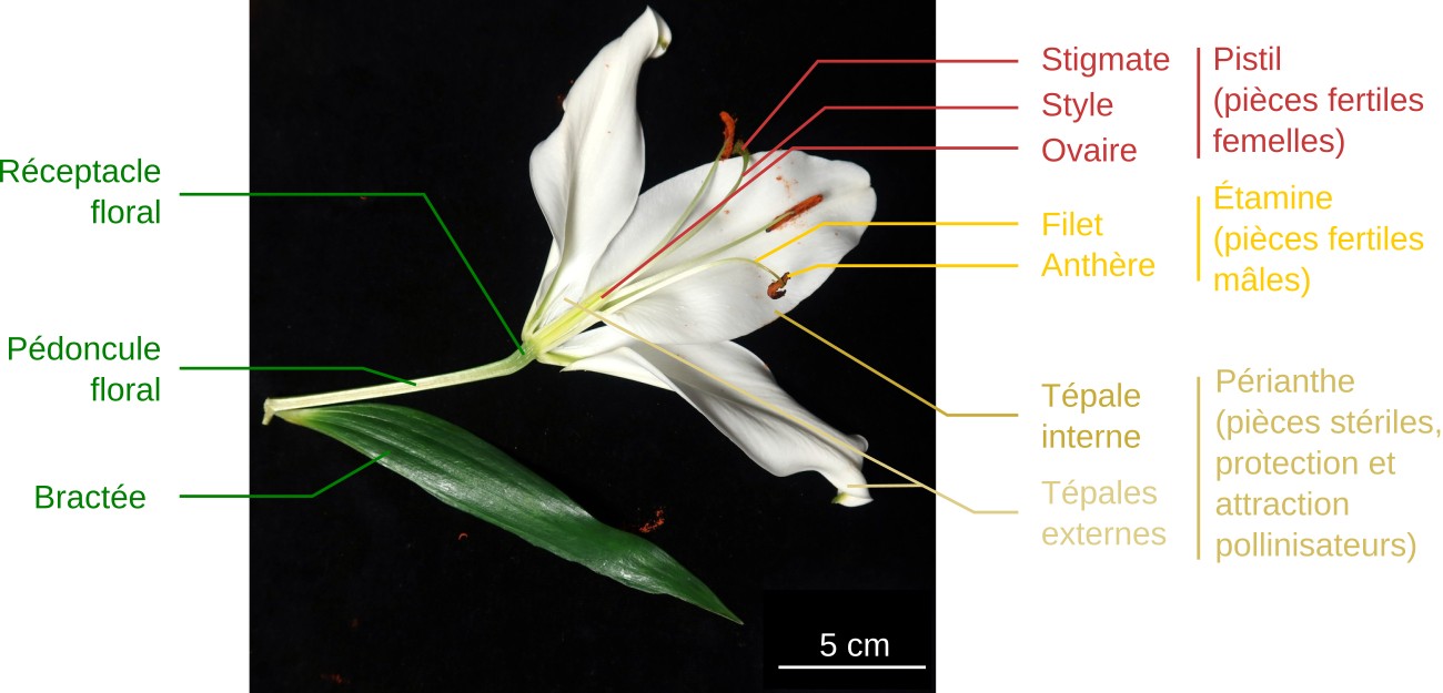 Les pièces florales forment quatre verticilles, c’est-à-dire quatre cercles concentriques de pièces similaires. Elles s’attachent au réceptacle floral, renflement de l’extrémité du pédoncule floral. Chez le lis, les pièces florales des deux premiers verticilles ne sont pas distinguables morphologiqu...