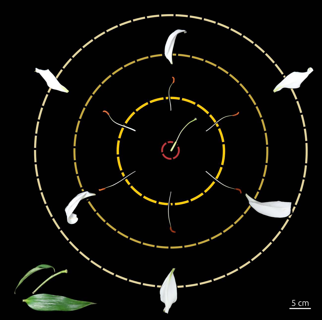 Dissection florale de lis avec les pièces de la base de la fleur en bas à gauche (bractée primaire et secondaire, pédoncule floral, réceptacle floral) et au centre les verticilles de pièces florales (de l’extérieur vers l’intérieur : 3 tépales externes ; 3 tépales internes ; 6 étamines ; 3 carpelles soudés).