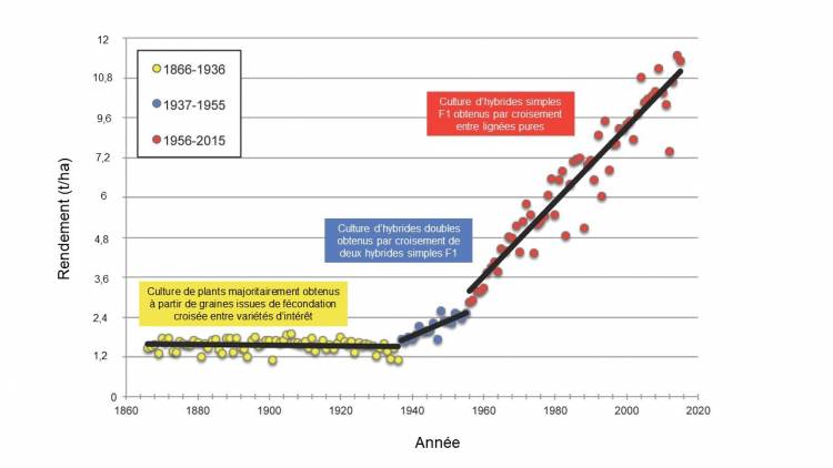 Entre 1866 et 1936, les graines semées présentent des taux d’homozygotie variables, elles sont issues de la fécondation croisée entre deux variétés sélectionnées précédemment pour leurs caractéristiques intéressantes (en jaune). Durant la période 1937-1955, des hybrides doubles sont commercialisés et utilisés. Ils proviennent du croisement entre deux hybrides simples, eux-mêmes issus du croisement entre deux lignées pures. Cependant, ces hybrides doubles se révèlent moins performants que les hybrides simples et sont peu à peu retirés de la commercialisation. À partir de 1956, les forts gains de rendement sont générés par l’utilisation d’hybrides simples, de manière à maximiser l’effet d’hétérosis, mais également par l’utilisation de plus en plus importante de produits phytosanitaires et d’engrais.