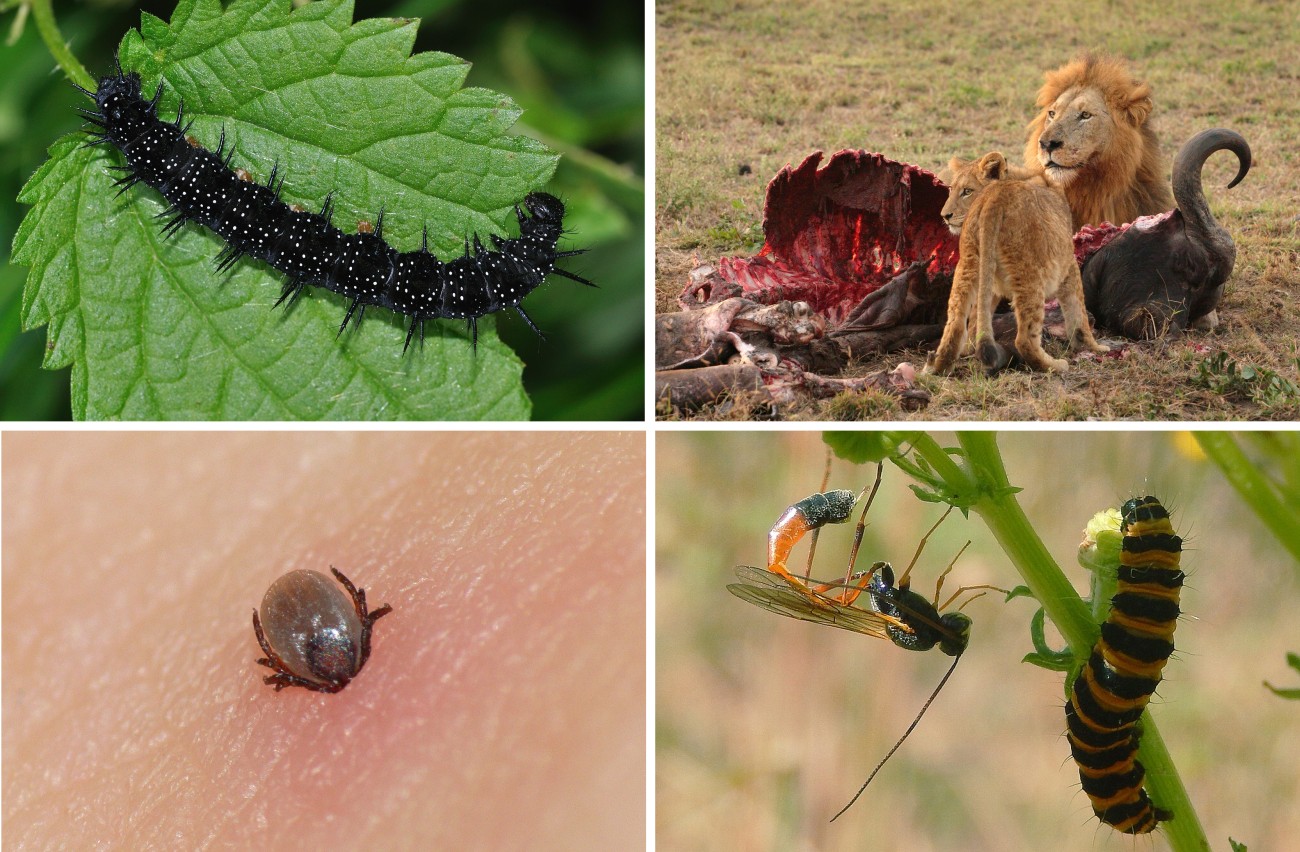 De gauche à droite et de haut en bas : Herbivorie : Une chenille de paon-du-jour (Aglais io) mange une feuille de grande ortie (Urtica dioica). Prédation : une famille de lions dévore un buffle d’Afrique. Parasitisme : une tique en train de mordre un humain. Parasitoïde : un ichneumon (guêpe parasit...