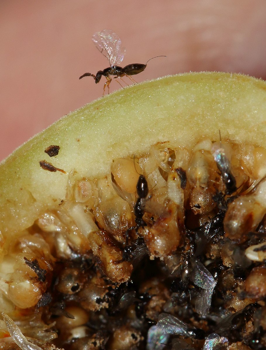 De gauche à droite et de haut en bas : Herbivorie : Une chenille de paon-du-jour (Aglais io) mange une feuille de grande ortie (Urtica dioica). Prédation : une famille de lions dévore un buffle d’Afrique. Parasitisme : une tique en train de mordre un humain. Parasitoïde : un ichneumon (guêpe parasit...