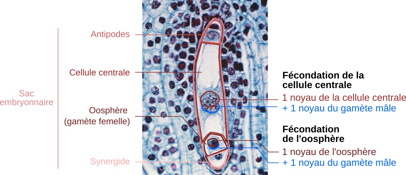 Observation en microscopie optique d’un sac embryonnaire après l’arrivée du tube pollinique. Le micropyle est situé vers le bas de l’image. On distingue bien la double fécondation avec les deux fusions nucléaires : fécondation de l’oosphère par l’un des noyaux spermatiques et fécondation de la cellu...