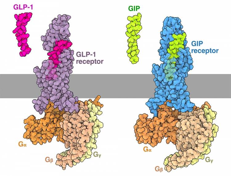À gauche, le GLP-1 se lie au récepteur GLP-1, qui est lui-même lié à une protéine G trimérique (entrée PDB 6B3J). À droite, la liaison du GIP à un récepteur GIP lié à une protéine G a été représentée (entrée PDB 7RA3).