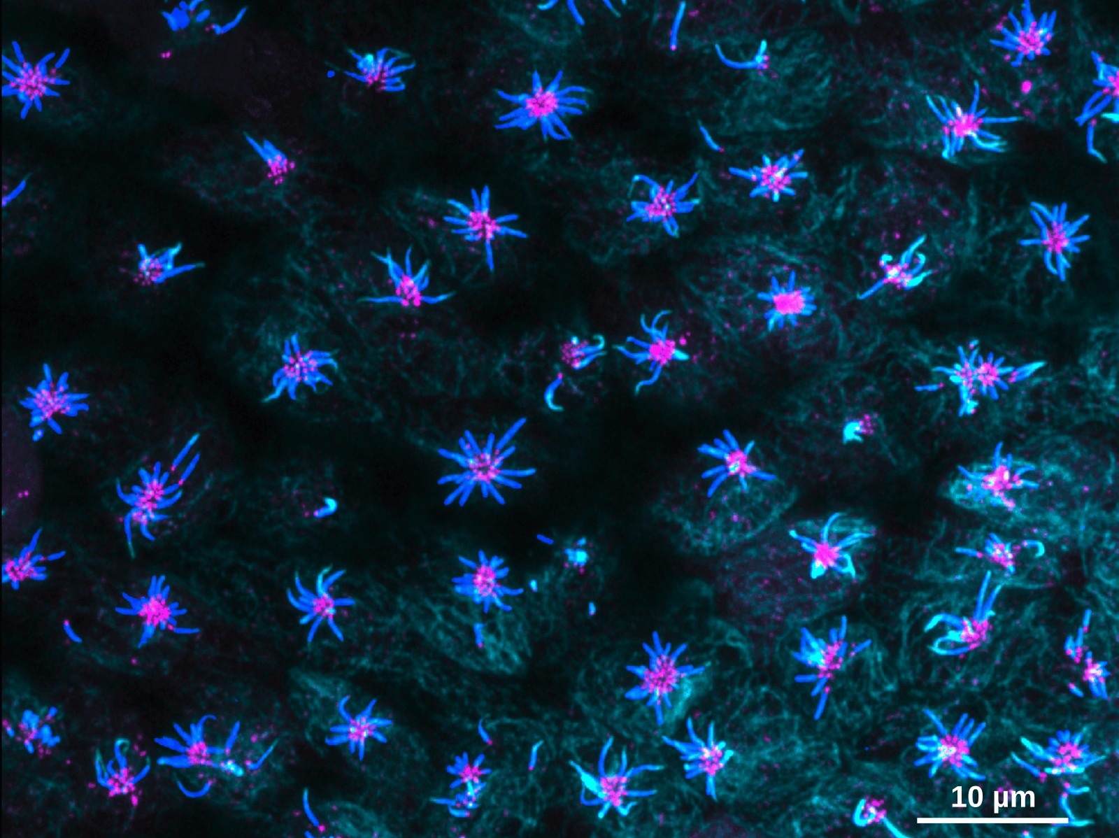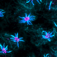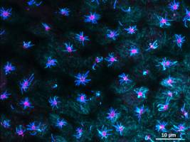 C. Étude des plaques amyloïdes dans un modèle génétique de maladie d’Alzheimer : la zone pathologique, riche en plaques amyloïdes est repérée par le rectangle rouge, les plaques apparaissent comme des points brillants qui peuvent être précisément délimités pour étudier leur géométrie en 3D.