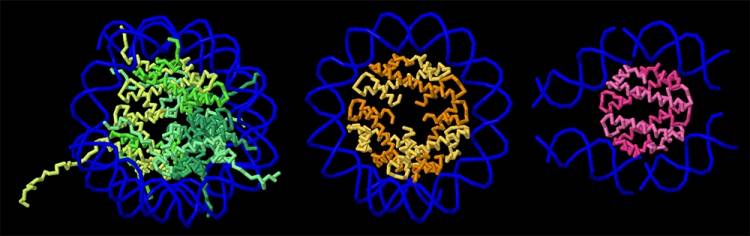 Une comparaison des histones de l’organisme eucaryote Xenopus laevis (en vert, à gauche), de l’archée Methanothermus fervidus (en orange, au centre) et de la bactérie Leptospira perolatii (en rose, à droite).