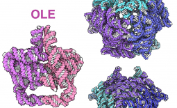 L’ARN OLE de Clostridium botulinum (entrée PDB 9lcr) est représenté en rose à gauche. Les ARN ROOL peuvent former des cages composées de 6 sous-unités (en haut à droite, entrée PDB 9j6y) ou 8 sous-unités (en bas à droite, entrée PDB 9mds).