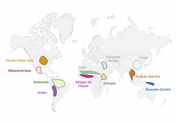 - Amazonie et Andes (à partir de – 6 000 ans ; patate douce, pomme de terre, manioc, coton, poivron, ananas, papaye, quinoa, tabac, cacahuète)