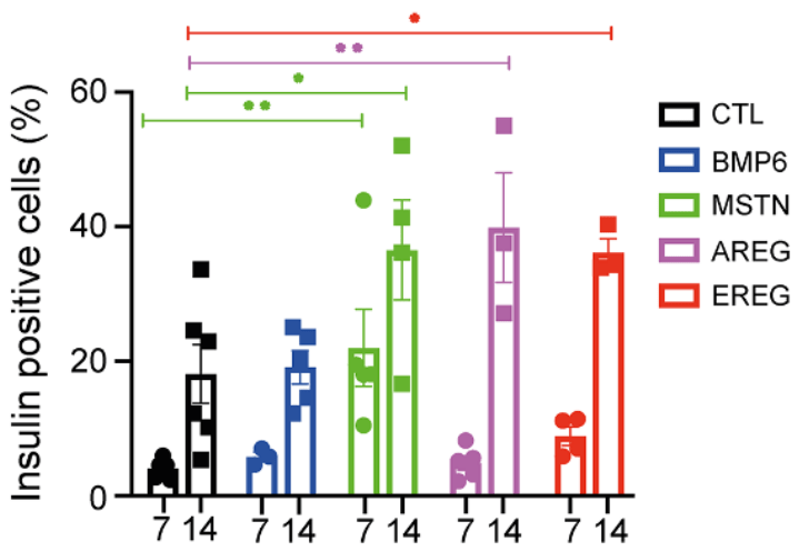 Des bourgeons pancréatiques sont exposés aux protéines BMP6, MSTN, AREG ou EREG ou à aucune protéine dans le témoin (CTL). Le pourcentage de cellules pancréatiques exprimant de l’insuline est ensuite mesuré après 7 et 14 jours. Seules les protéines MSTN, AREG et EREG provoquent une différenciation des cellules β dans le pancréas.