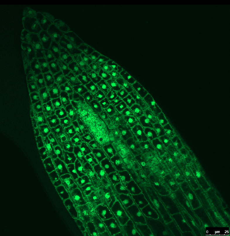 On distingue bien la racine en formation avec des poils absorbants, et deux feuilles avec des tissus vasculaires en différenciation. Mosaïque composée à partir de différents clichés en microscopie optique.