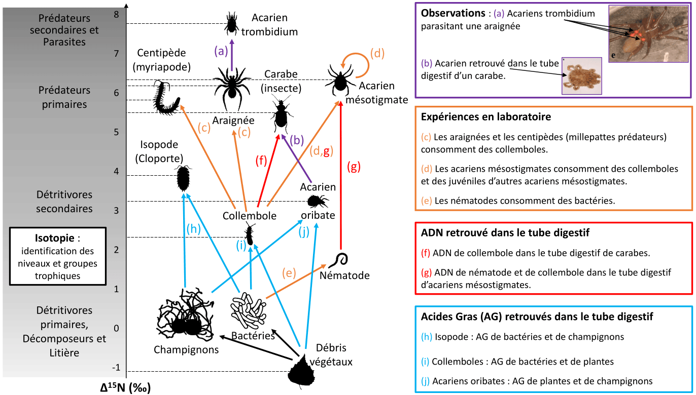 L’isotopie, en particulier le $\delta^{15}\mathrm{N} = \left( \frac{ \left(\frac{^{15}\mathrm{N}}{^{14}\mathrm{N}}\right)_{\text{échantillon}} }{ \left(\frac{^{15}\mathrm{N}}{^{14}\mathrm{N}}\right)_{\text{atmosphère}} } - 1 \right) \times 1000$, permet d’identifier le niveau trophique des organismes (traits horizontaux en pointillés noirs). D’autres méthodes permettent d’identifier des liens trophiques (en violet, orange, rouge, et bleu) entre différents acteurs du réseau. Certains acteurs peuvent consommer des congénères (flèche circulaire (d) sur l’acarien prédateur). Certains groupes taxonomiques (ex : acariens) peuvent avoir des rôles trophiques très différents (parasites, prédateurs, détritivores). Les liens présentés ici sont binaires (il y a une interaction, ou pas), mais une interaction trophique peut avoir différentes intensités (intensité forte : le consommateur dépend exclusivement d’une seule ressource ; intensité faible : le consommateur consomme occasionnellement voire rarement cette ressource, ou en petites quantités). Enfin, une absence de lien ne signifie pas qu’il n’y a pas d’interaction ; il se peut simplement qu’elle n’ait pas été observée. C’est l’accumulation de différents indices avec différentes méthodes (ex : flèche (d, g)) et différents niveaux de preuves (l’isotopie ne suffit pas à relier deux acteurs du réseau), issus de différentes études, qui permet de reconstituer des réseaux de plus en plus robustes et fiables. Les illustrations noires proviennent de phylopic.org. Références : flèche (a) 1, flèche (b) 2, flèche (c) 3, flèche (d) 4, flèche (e) 5, flèche (f) 6, flèche (g) 7, flèches (h, i, j) 8, flèches noires 910.