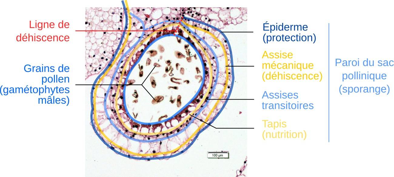 L’anthère est formée de deux paires de sacs polliniques à l’intérieur desquels se forment les grains de pollens. À maturité, les sacs polliniques s’ouvrent au niveau de la zone de déhiscence entre chaque paire et libèrent le pollen. L’anthère est portée par le filet, le tout constituant l’étamine.