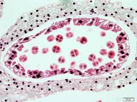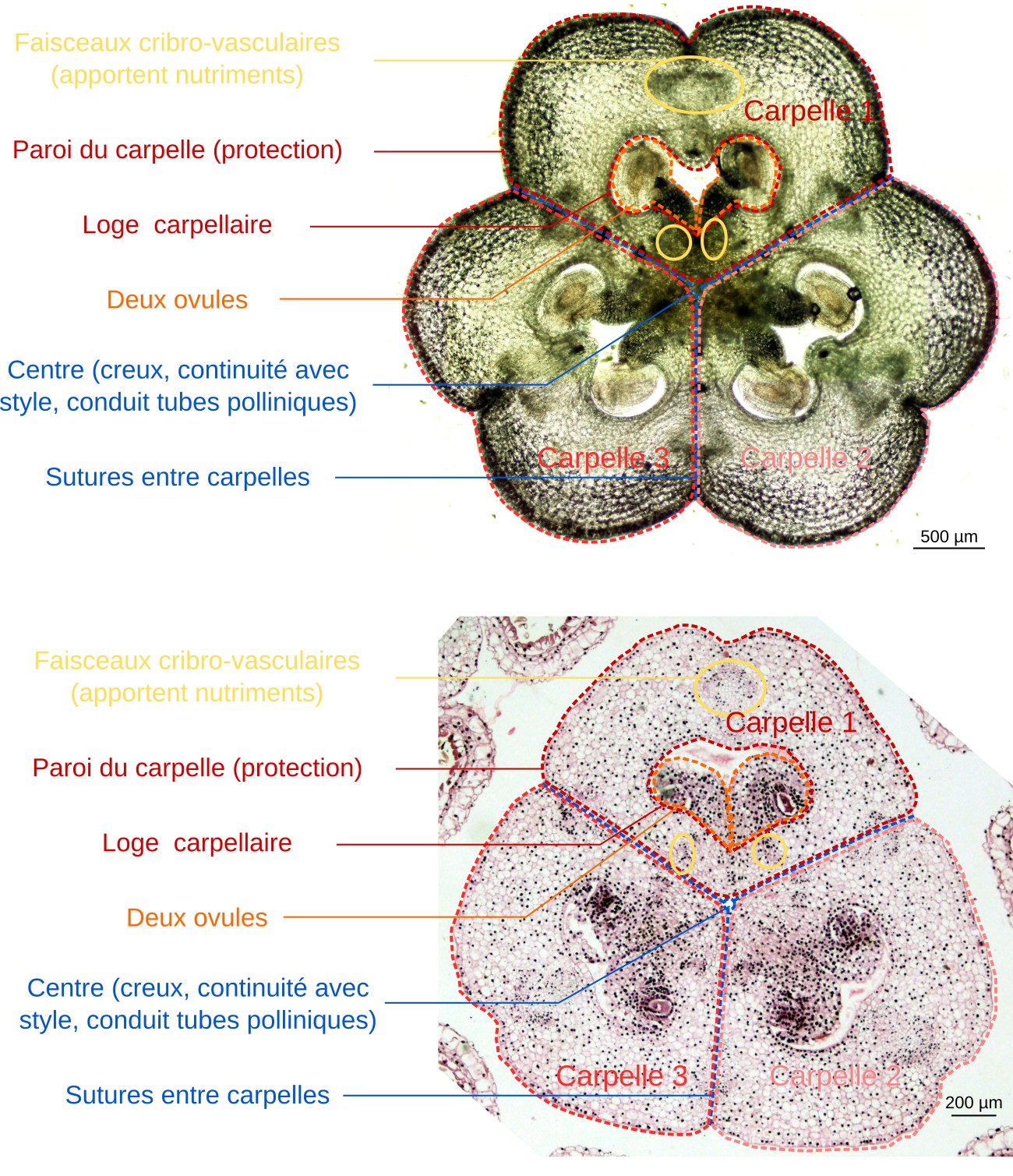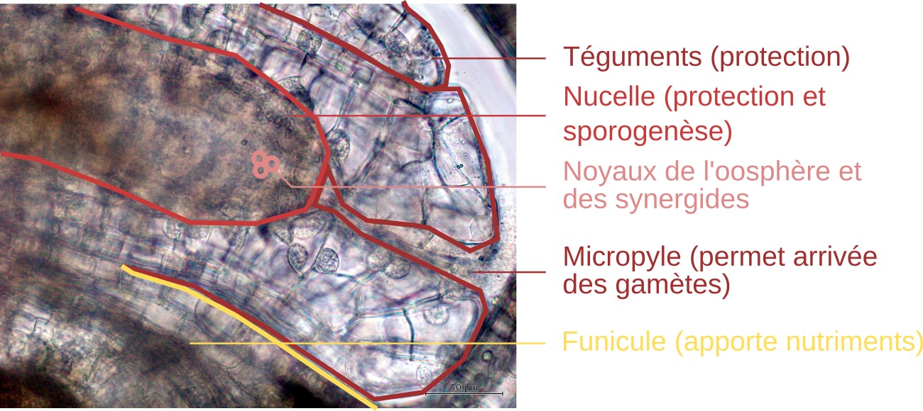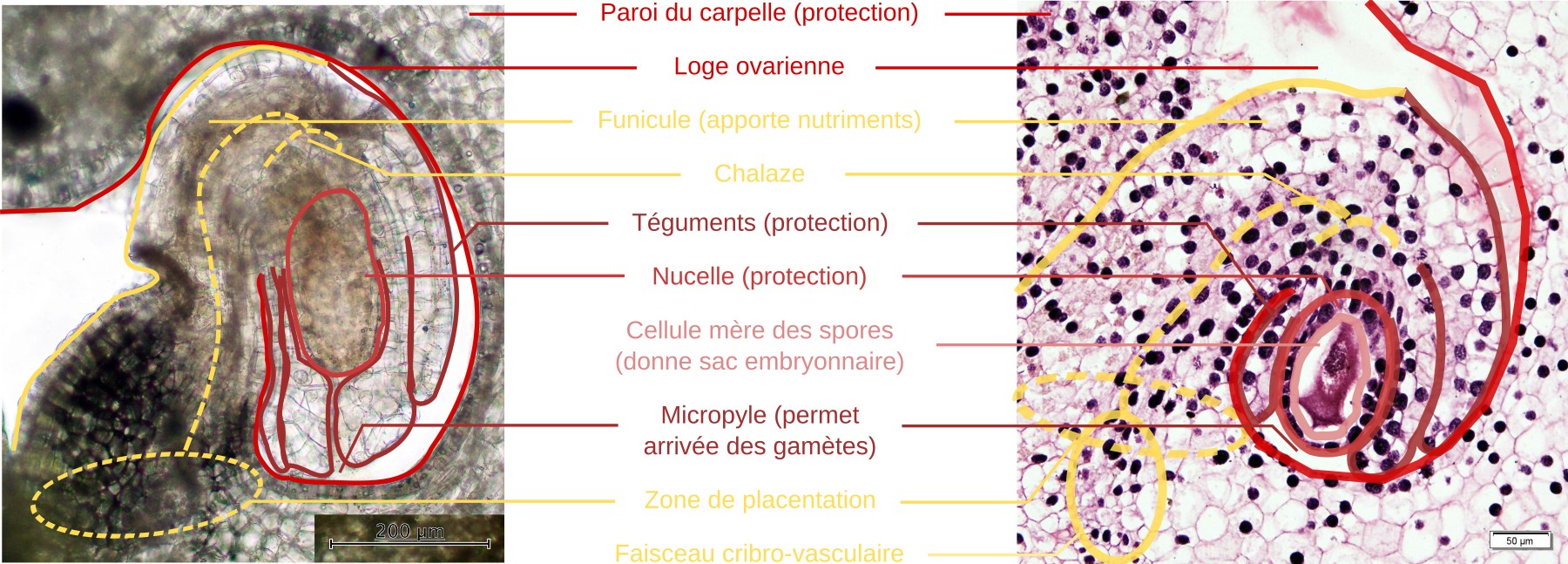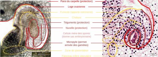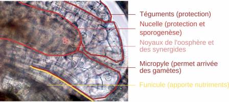 À gauche : coupe à main levée ; à droite : préparation histologique (stade avant méiose, toutes les cellules visibles sont diploïdes et produites par le sporophyte). On distingue bien les deux téguments protecteurs, discontinus au niveau du micropyle, le nucelle (sporange femelle) et la structure qu...