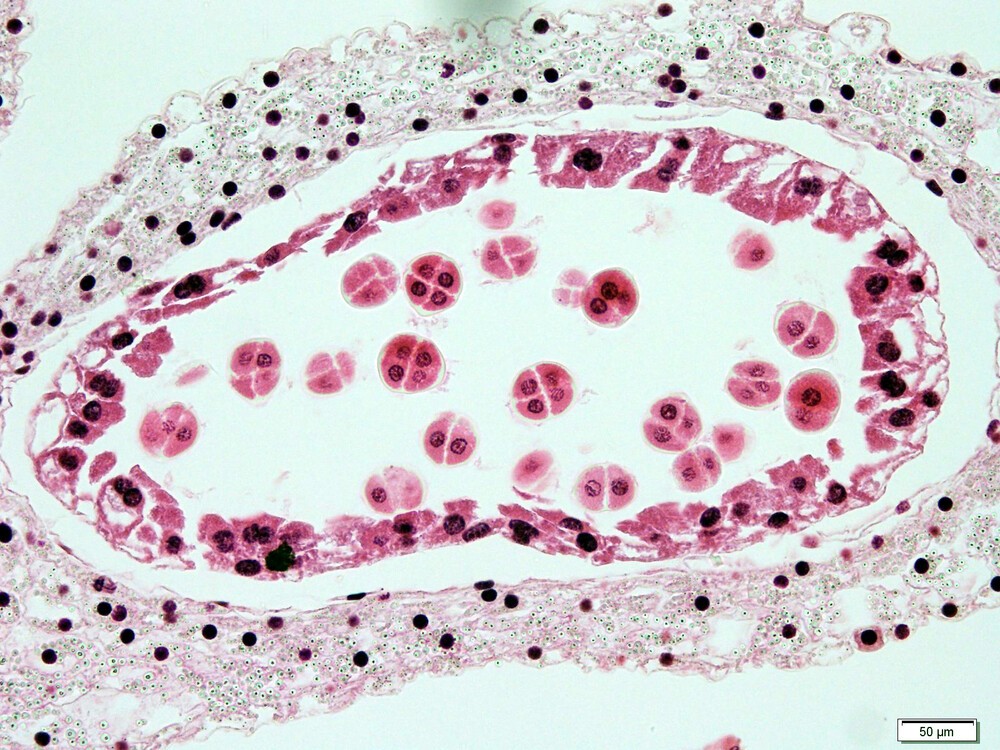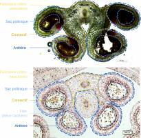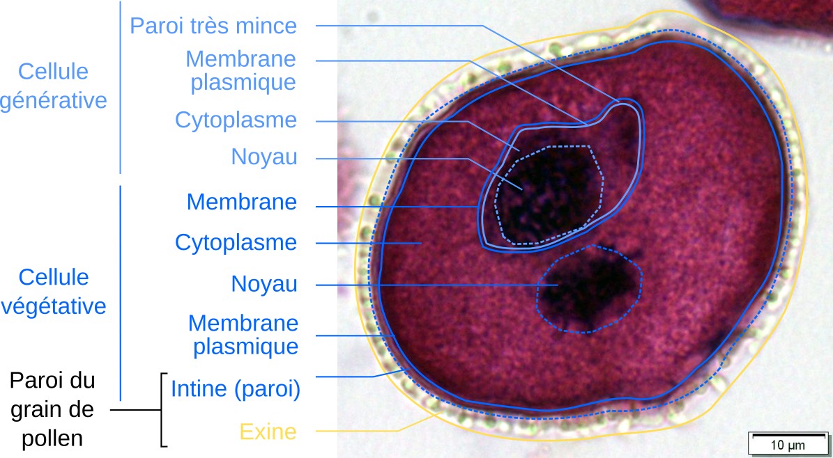 Les grains de pollen sont produits dans les sacs polliniques des anthères. Ces sacs polliniques contiennent les cellules mères des spores, diploïdes. Lorsqu’une cellule mère des spores entre en méiose, elle produit quatre spores mâles haploïdes contenues dans une même paroi. Après dégradation de la ...