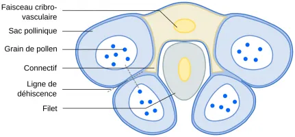 L’anthère est formée de deux paires de sacs polliniques à l’intérieur desquels se forment les grains de pollens. À maturité, les sacs polliniques s’ouvrent au niveau de la zone de déhiscence entre chaque paire et libèrent le pollen. L’anthère est portée par le filet, le tout constituant l’étamine.