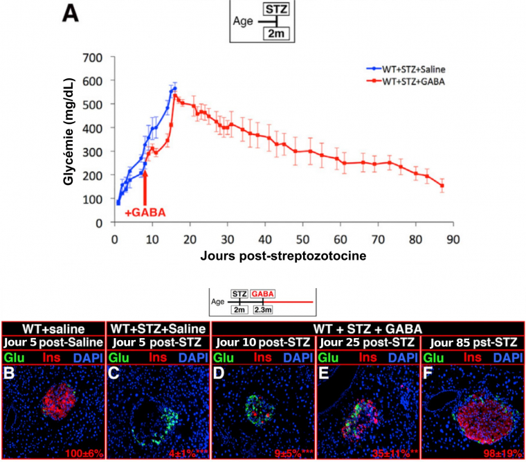 A. Des souris sauvages (WT, wild-type) de deux mois sont traitées avec des doses élevées de streptozotocine (STZ) pour détruire leurs cellules β et sont ensuite traitées au GABA ou avec une solution saline. Ces dernières décèdent d'hyperglycémie alors que les souris ayant reçu du GABA, après un pic, retrouvent une glycémie normale.