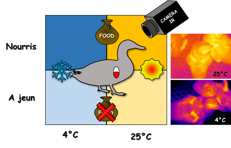 Deux conditions ont été croisées : la température (4 °C, bleu ou 25 °C, orange) et la disponibilité en nourriture. La température corporelle a été mesurée à l’aide de capteurs présents dans le gésier et d’une caméra infrarouge. À droite, deux images thermiques de canetons prises à 25 °C et à 4 °C.