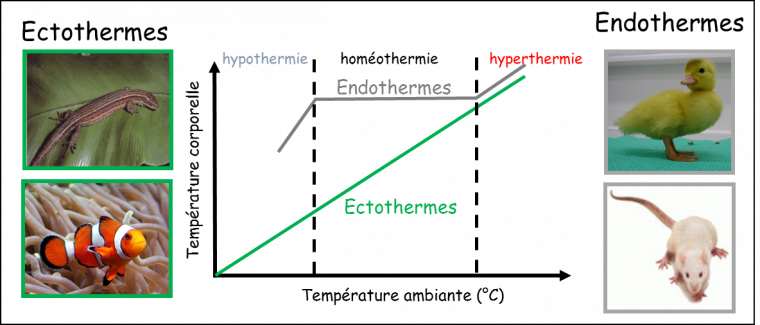 Deux stratégies sont ainsi principalement rencontrées chez les animaux : l’ectothermie et l’endothermie, en fonction de la capacité à produire ou non de la chaleur (Figure 1).