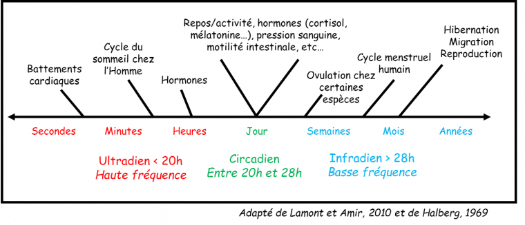 Outre les cycles saisonniers ou infradien (hibernation, estivation) et les cycles journaliers ou circadiens (torpeur), il existe un cycle à une échelle de temps plus fine, le cycle ultradien, dont dépendent de nombreux phénomènes physiologiques (Figure 3).