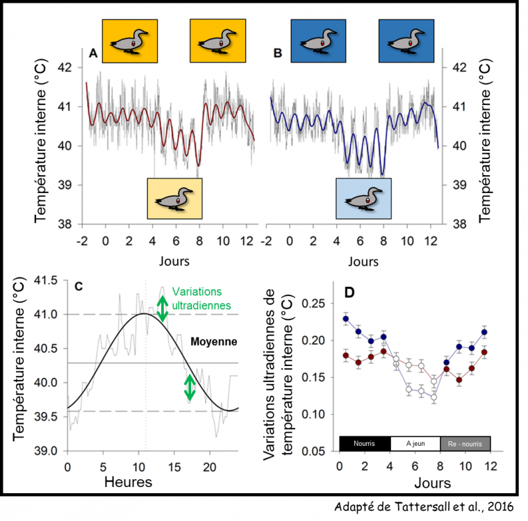 Pour résumer, les canetons, qu’ils soient à température ambiante ou soumis à un froid intense, régulent de manière très fine leur température interne tant qu’ils sont nourris correctement. Mais ce n’est plus le cas à jeun : la contrainte thermique devient alors trop importante et entraîne une hypothermie principalement nocturne. L’étude montre ainsi que le coût énergétique des changements de température à très court terme est abaissé au maximum chez les canetons soumis au froid et au jeûne : le gain énergétique permis par la thermorégulation ultradienne est compris entre 7 et 10,5 % du métabolisme de base, ce qui est loin d’être négligeable car ce dernier est incompressible. L’énergie ainsi économisée pourrait alors être stockée ou affectée à d’autres postes comme la croissance, la reproduction, etc. Cette étude, la première montrant la diminution des variations ultradiennes de température interne chez les oiseaux, soulève de nombreuses questions sur la gestion de ces rythmes dans l’optimisation des stratégies de conservation énergétique chez les animaux lors de fortes pressions environnementales.