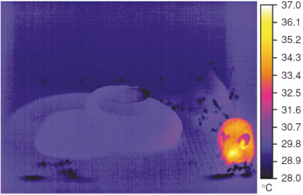 L’étude a mobilisé des canetons de Barbarie âgés de 5 semaines, répartis en deux groupes égaux en fonction de la température environnante : les premiers ont été placés dans des conditions de froid intense (5 °C), alors que les seconds sont restés à neutralité thermique (25 °C). Les canetons ont été équipés de capteurs de température interne se présentant sous la forme de petites pilules stockées dans leur gésier tout au long de l’expérience. Puis chaque groupe a connu, sur trois périodes égales de 4 jours, une phase d’alimentation à volonté, puis un jeûne alimentaire et enfin une réalimentation. En plus du froid, les animaux ont donc été soumis à un stress supplémentaire : la disponibilité en nourriture. Les variations de la température corporelle ont alors pu être analysées très finement, les capteurs émettant des mesures toutes les 15 minutes. Parallèlement, une caméra thermique infrarouge a permis de mesurer les fluctuations de la température au niveau du bec des canetons (Figure 4).