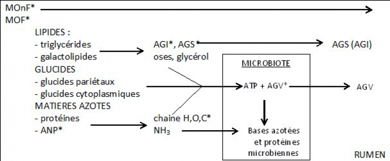 MOnF : matière organique non fermentée, MOF : matière organique fermentée, ANP : azote non protéique, AGS : acides gras saturés, AGI : acides gras insaturés, AGV : acides gras volatils.