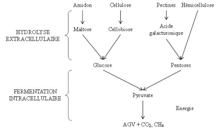 L’hydrolyse extracellulaire des glucides végétaux complexes produit des glucides simples qui vont pouvoir être absorbés et fermentés par les microorganismes, principalement les bactéries.