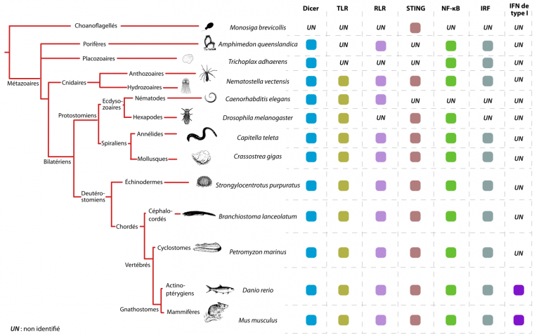 Les facteurs de l’immunité innée présents chez des espèces représentatives des différents groupes de Métazoaires (animaux) est indiquée par des carrés colorés. UN : non-identifié. Les Choanoflagellés constituent l'extragroupe.