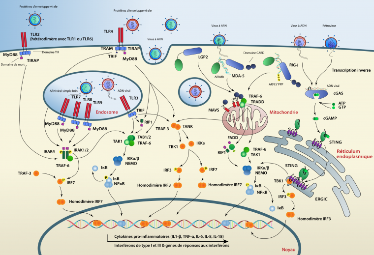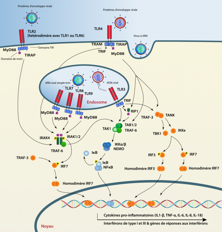 Les TLR sont des protéines transmembranaires composées de trois domaines : un domaine extracellulaire (ou tourné vers la lumière de l’endosome) contenant un nombre variable de répétitions riches en leucine ou LRR (Leucine Rich Repeats), un domaine transmembranaire et un domaine cytoplasmique, le domaine TIR (Toll/interleukin-1 receptor homology domain). Chez l’Homme, dix TLR ont été identifiés mais seuls les TLR3, 7 et 8, présents au niveau des endosomes, seront activés après interaction avec l’ARN viral. Le TLR3 se lie de manière spécifique aux ARN double brin et, après oligomérisation, recrute la protéine adaptatrice TRIF (TIR-domain-containing adapter-Inducing IFN-β). Deux voies de signalisation peuvent ainsi être activées, la voie interféron via le facteur de transcription IRF3 permettant l’expression de l’IFN-β, ou la voie NF-κB via le facteur de transcription NF-κB permettant l’expression de cytokines pro-inflammatoires. Les TLR7 et 8 vont être activés après la reconnaissance d’ARN simple brin et vont recruter la protéine adaptatrice MyD88 (Myeloid Differentiation primary response 88). Ceci va entraîner l’activation des facteurs de transcription IRF5, IRF7 et NF-κB permettant l’expression de l’IFN-α et de cytokines pro-inflammatoires [3].