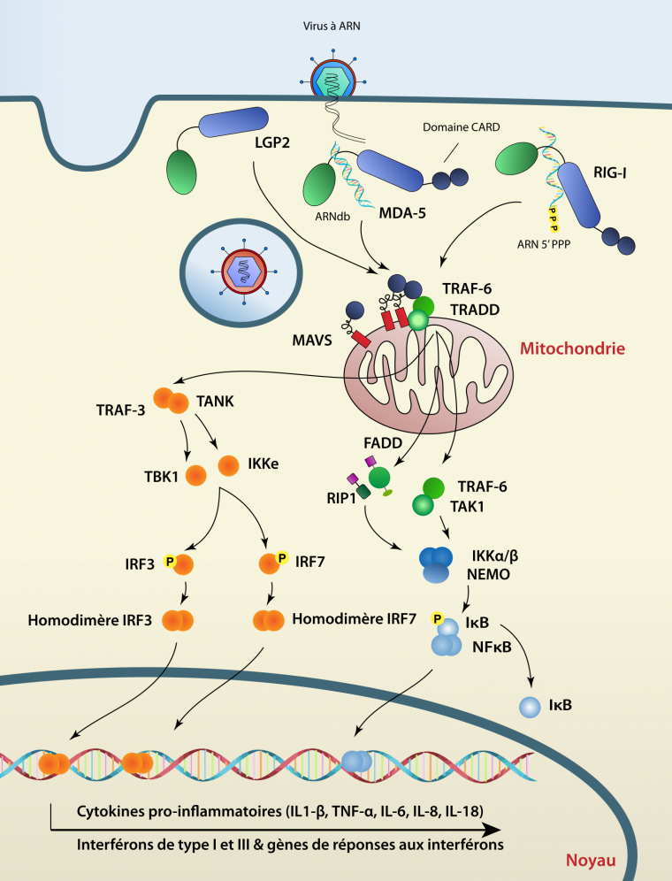 Les RLR sont des protéines cytoplasmiques capables de détecter la présence d’ARN double brin dans le cytoplasme, caractéristique d’une infection par un virus. Dans l’espèce humaine, la famille des RLR est composée de trois membres : RIG-I (retinoic acid-inducible gene I), MDA5 (melanoma differentiation associated gene 5) et LGP2 (laboratory of genetics and physiology 2). Les RLR sont caractérisées par un domaine central de type DEAD-box helicase/ATPase et un domaine de régulation C-terminal (CTD) indispensable pour la reconnaissance des ARN et l’autorépression en absence d’ARN. En plus, RIG-I et MDA5 possèdent un domaine CARD (caspase activation and recruitment domains) en position N-terminale, absent chez LGP2. L’oligomérisation de RIG-I et MDA5 permet le recrutement de la protéine adaptatrice MAVS (mitochondrial antiviral signaling protein) située au niveau de la mitochondrie via une interaction entre les domaines CARD respectifs des deux protéines. Le déclenchement d’une cascade de signalisation entraîne l’activation des facteurs de transcription NF-κB et IRF3 induisant l’expression des gènes antiviraux [3].