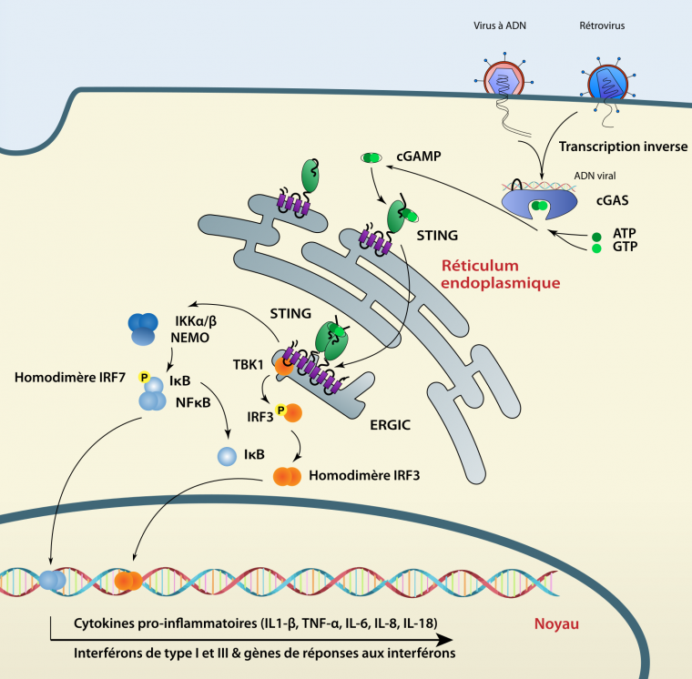 La reconnaissance d’ADN viral dans le cytosol est permise par cGAS. Lorsqu’elle se lie à l’ADN, cette enzyme synthétise, à partir d’ATP et de GTP, le 2’3’-GMP-AMP cyclique (cGAMP). Ce second messager active alors STING, une protéine adaptatrice qui, comme MAVS et TRIF, est fixée au réticulum endoplasmique grâce à des domaines transmembranaires. Le changement de conformation de STING, induit par son interaction avec le 2’3’-cGAMP, libère son domaine C-terminal (CTT, C-terminal tail) dans le cytoplasme. Pour activer IRF3 et la réponse interféron, STING forme un homodimère au niveau périnucléaire. Ceci permet sa phosphorylation par la kinase TBK1, servant ainsi de point d’ancrage à IRF3 [3]. STING est indispensable à la réponse antivirale contre les virus à ADN tels que le virus de l’herpès simplex I (HSV-I) [36]. De plus, STING a la capacité d’interagir, avec une plus faible affinité, avec d’autres dinucléotides cycliques tels que le 2’2’-cGAMP, le 3’2’-cGAMP ou les dinucléotides cycliques bactériens comme ceux produits par Listeria monocytogenes [37–39].