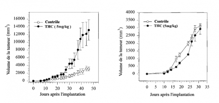 En présence de THC, on n’observe aucune variation par rapport au témoin dans la croissance des tumeurs chez des souris SCID, immunodéficientes.