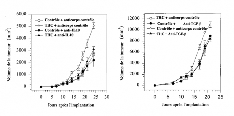 On observe donc que le THC a pour effet d’induire, en réponse à une tumeur : une hausse de la sécrétion de TGF-ß et d’IL-10 (interleukine 10), et une baisse de la sécrétion d’IFN-γ. Il est intéressant de noter que l’administration de THC a comme conséquence une hausse de cytokines inhibant les cellules du système immunitaire, et une baisse de celles activant ces mêmes cellules. Ces résultats sont donc cohérents avec les observations d’une hausse de la tumorigénicité causée par le THC.