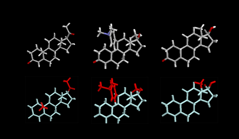 De gauche à droite : molécule de progestérone, molécule de mifépristone et molécule de lévonorgestrel.
