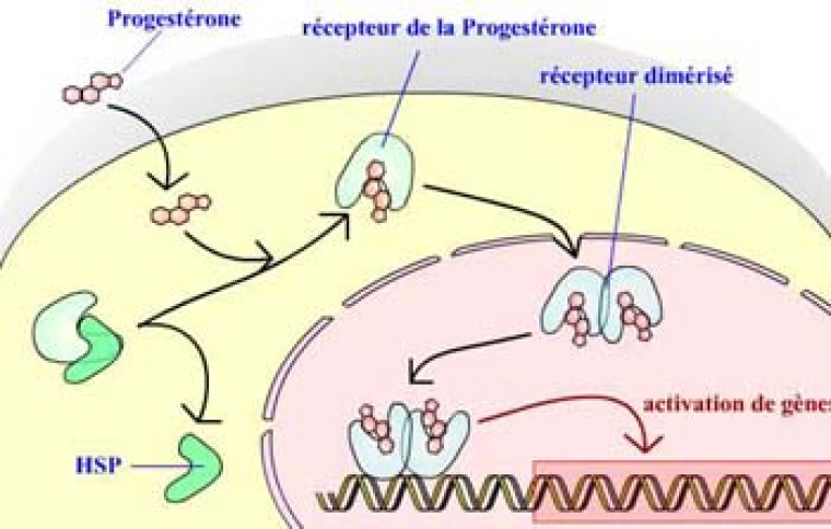 Hormone stéroïdienne, la progestérone est une molécule lipophile : elle peut ainsi passer passivement à travers les membranes biologiques. Elle se fixe alors sur un récepteur intracellulaire.