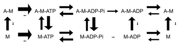 En revanche, si le Pi se dissocie (pour donner majoritairement A-M-ADP, le Pi se dissociant lentement de la myosine seule), il n’y a pas de retour possible (pas de flèche). En conséquence, c’est le départ du Pi qui stabilise la liaison actine-myosine. De même, en présence ou en absence d’ADP, il est peu probable que la liaison actine-myosine se dissocie (petites flèches). L’évolution majoritaire et rapide (grande flèche) consiste en l’arrivée d’un ATP (A-M-ATP), la réaction inverse étant très peu probable. Le départ du Pi entraîne donc quasi-automatiquement l’enchaînement des complexes venant d’être décrits, correspondant à la suite des évènements présentée dans le paragraphe précédent.