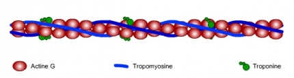 À chaque extrémité d’une molécule de tropomyosine, soit un intervalle correspondant à 7 molécules d’actine, une molécule de troponine vient se lier avec la tropomyosine (fig. 1). La troponine est une molécule composée de 3 chaînes respectivement dénommées troponine-T, troponine-I et troponine-C. Chaque chaîne possède une fonction différente :
