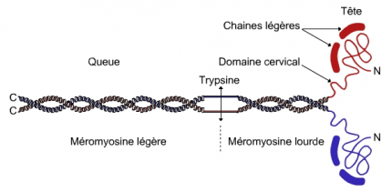 La myosine II est une molécule allongée de 2 × 240 kDa composée de deux chaînes lourdes (environ 200 kDa chacune) et de quatre chaînes légères (environ 20 kDa chacune). Chaque chaîne lourde est constituée d’une queue C-terminale allongée et fibrillaire en hélice alpha, d’une tête globulaire N-terminale enzymatique à activité ATPasique associée à deux chaînes légères, et d’un domaine cervical déformable reliant les deux extrémités. Tête globulaire et partie cervicale forment la méromyosine lourde, la partie fibrillaire caudale formant la méromyosine légère. Les queues allongées de deux chaînes lourdes de myosine s’enroulent l’une autour de l’autre en une superhélice, les deux têtes globulaires se trouvant côte à côte (voir fig. 2).