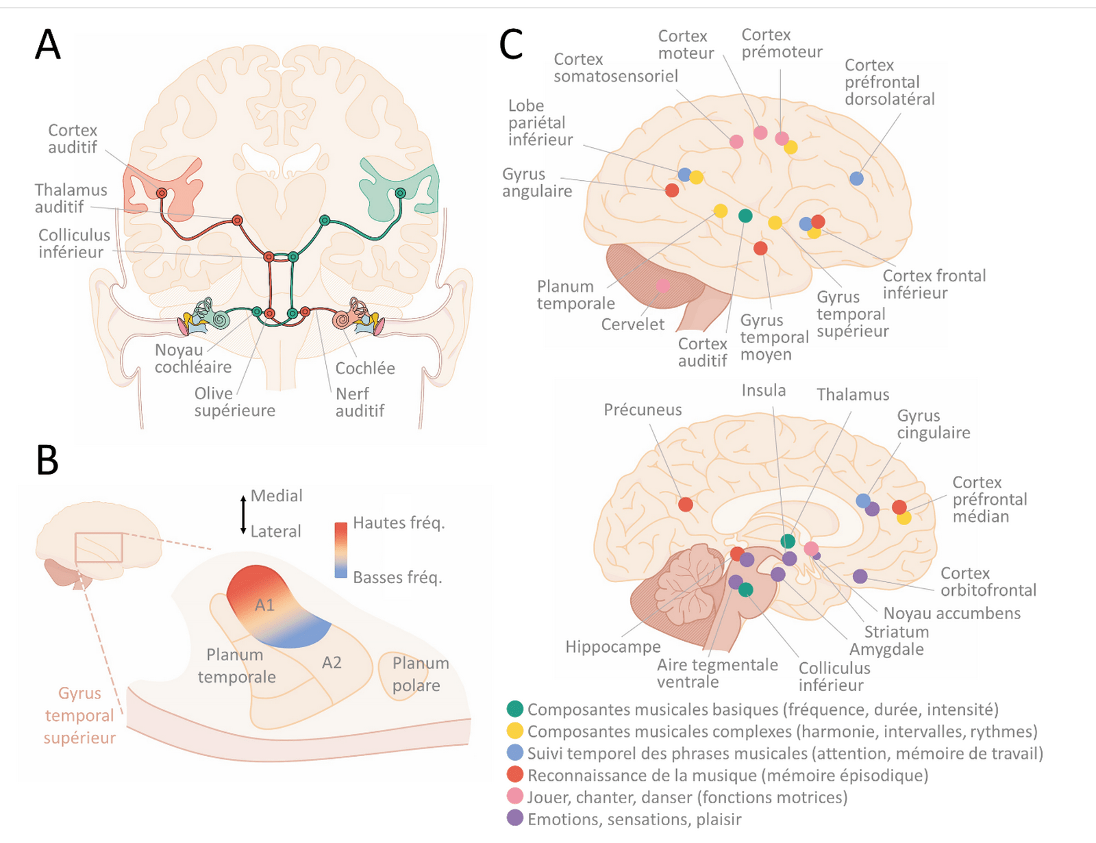 Même si l’on sait que le cortex auditif est nécessaire pour traiter l’information sonore, le rôle de toutes les zones susnommées dans le traitement des sons et a fortiori de la musique n’est pas complètement éclairci. La hauteur des sons (notes) serait traitée grâce à la tonotopie par A1, ainsi que par le planum temporale (belt) [30]. Lorsque les notes s’enchaînent en mélodie, l’activation se déplace vers des zones plus latérales et antérieures dans le cortex auditif [31]. Enfin, à mesure que des composantes plus complexes sont détectées (tonalité, rythmes complexes) ou que le recours à la mémoire et à l’attention augmentent, des zones frontales médiales et inférieures sont également activées en plus du gyrus temporal supérieur [32] (voir section suivante et Figure 2C). De manière générale, de nombreuses études ont observé une latéralisation du traitement de la musique, avec une activation plus forte de l’hémisphère droit [30, 33–35].