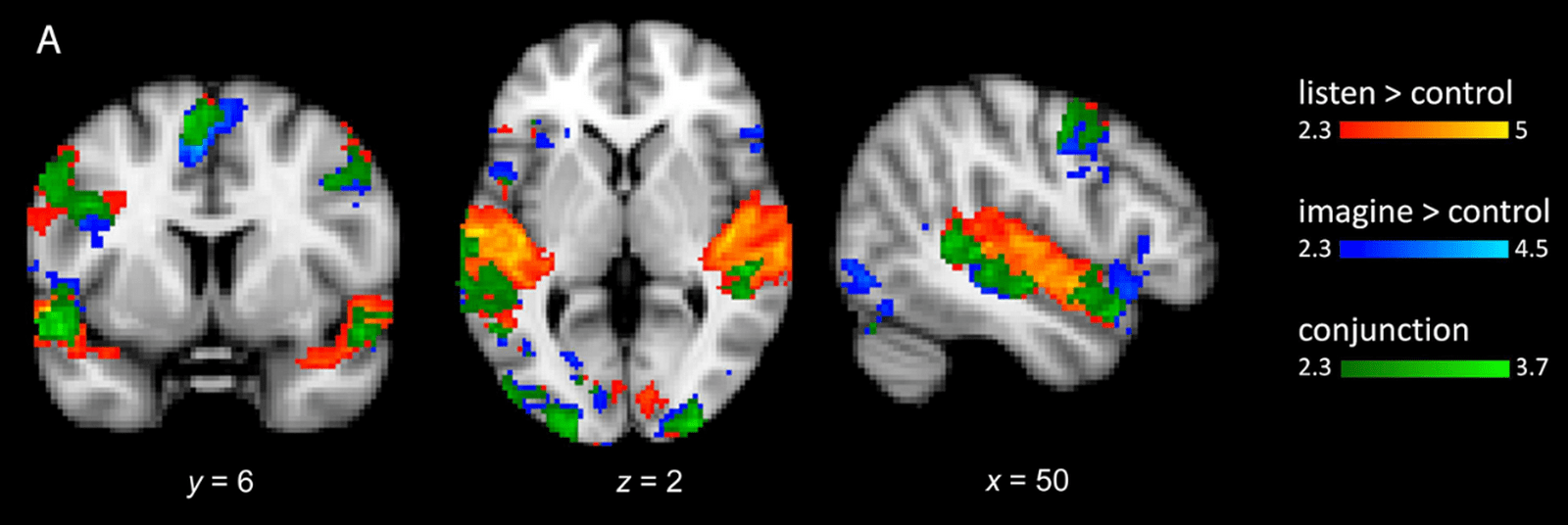 Le lieu où la musique est mémorisée n’est pas encore bien compris, et n’est probablement pas unique. On a observé qu’écouter de la musique connue et l’imaginer ne sont pas des processus cérébraux si différents, ils activent de nombreuses zones similaires dans le lobe temporal et la zone préfrontale inférieure [39–42]. Ces zones stockeraient donc une partie au moins de la mémoire musicale. Mais on peut aussi supposer qu’imaginer la musique provoque tout simplement le même traitement cérébral que l’écouter (Figure 3) !