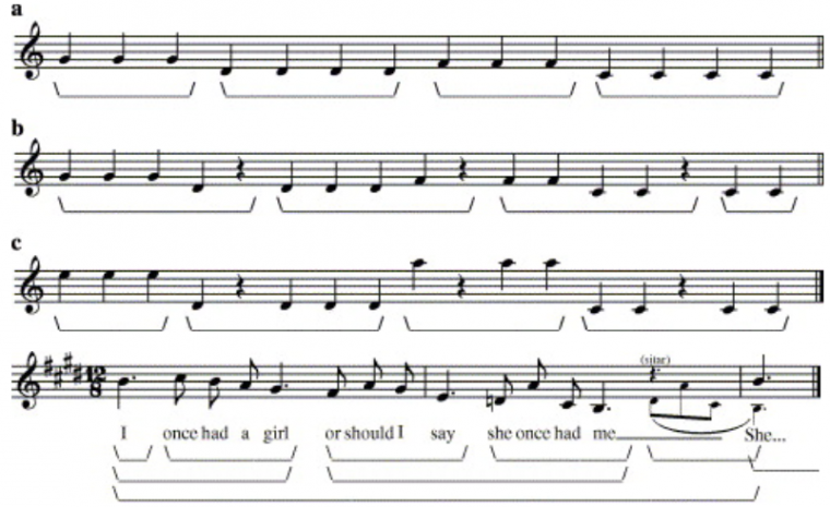 a) À l’écoute, les mêmes notes semblent former des regroupements ; b) il y a un saut de note mais la pause crée une grande distance entre les notes, c’est elle qui crée ici les regroupements ; c) le saut de note est si grand que c’est lui, et non la pause, qui crée des regroupements ; dernière ligne : première notes de Norwegian wood des Beatles : les pauses et les proximités de notes créent des regroupements progressifs imbriqués les uns dans les autres et ne suivant pas toujours les mesures de séparation. Adapté de [22].