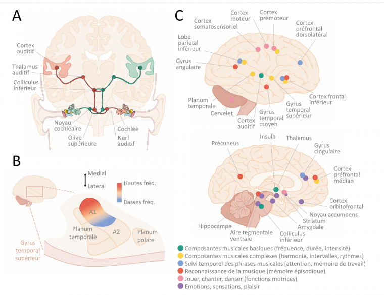 En simplifiant, la partie supérieure du lobe temporal, siège du cortex auditif, permet de traiter les composantes les plus fondamentales de la musique (notes, rythmes, mélodies) tandis que le lobe frontal, et plus particulièrement le cortex frontal inférieur, semble communiquer avec le lobe temporal pour identifier, traiter et percevoir les composantes plus complexes de la musique comme sa syntaxe. La perception de la musique par le cerveau reste cependant mal connue, peut-être en raison de sa structure acoustique complexe et parce que les modèles animaux se prêtent mal à l’étude de cette pure création culturelle humaine.